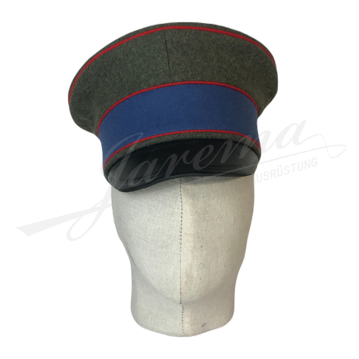 Visor cap for German Imperial Army made of feldgrau wool with woollen band and piping. Lining made of cotton satin, stitched by hand.