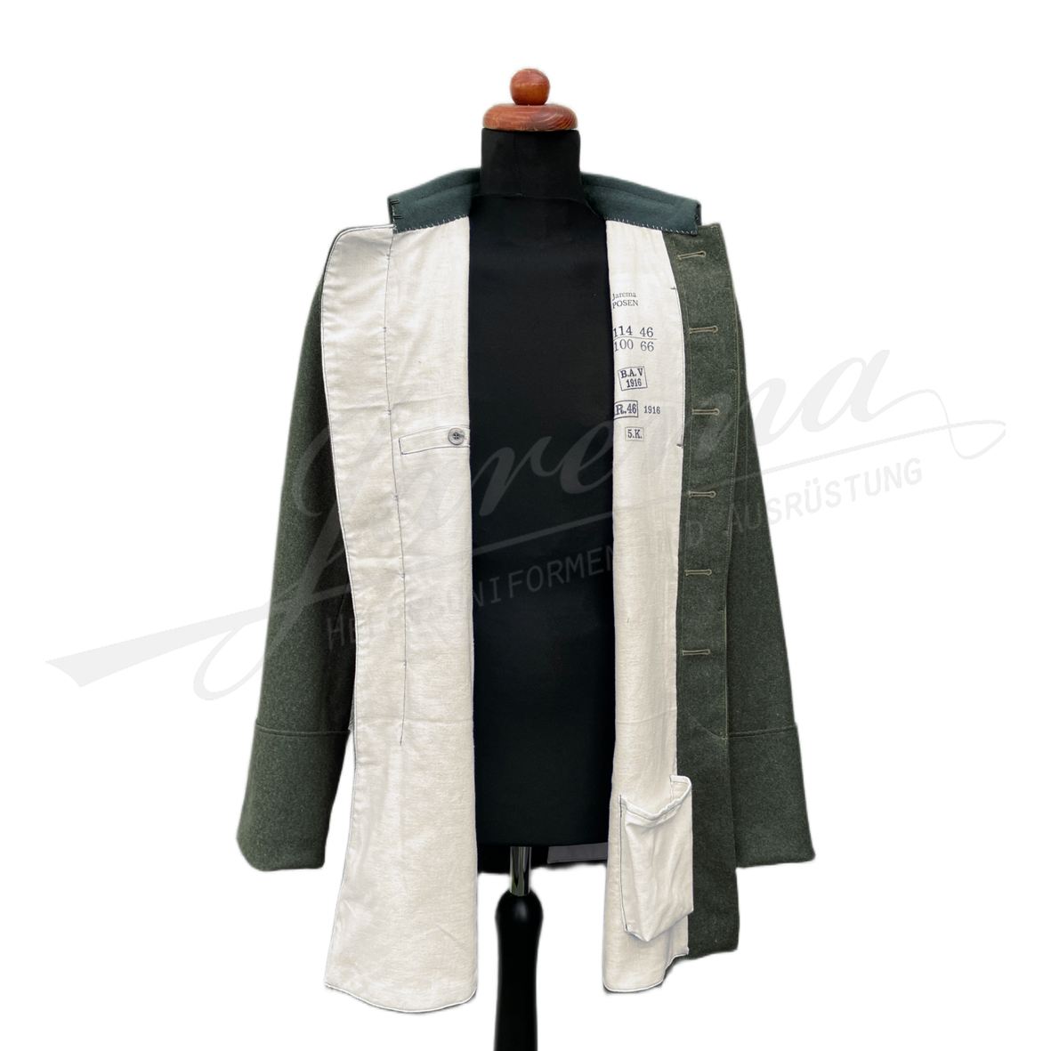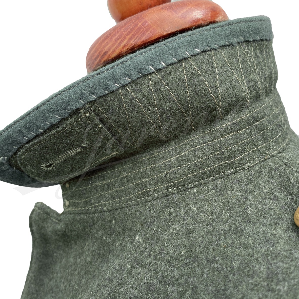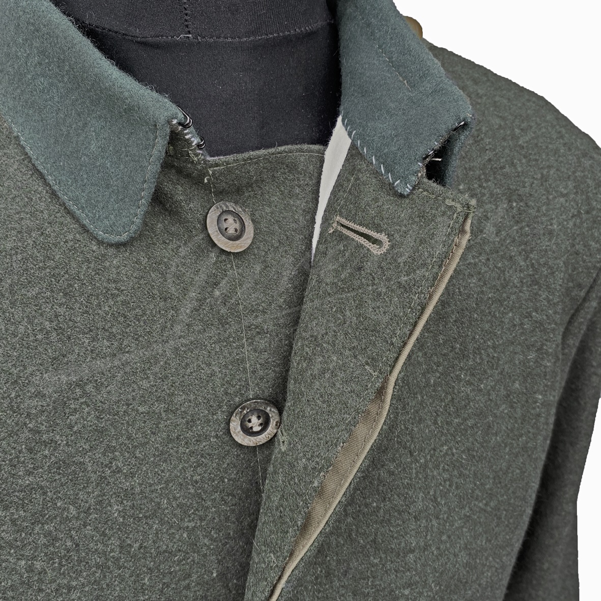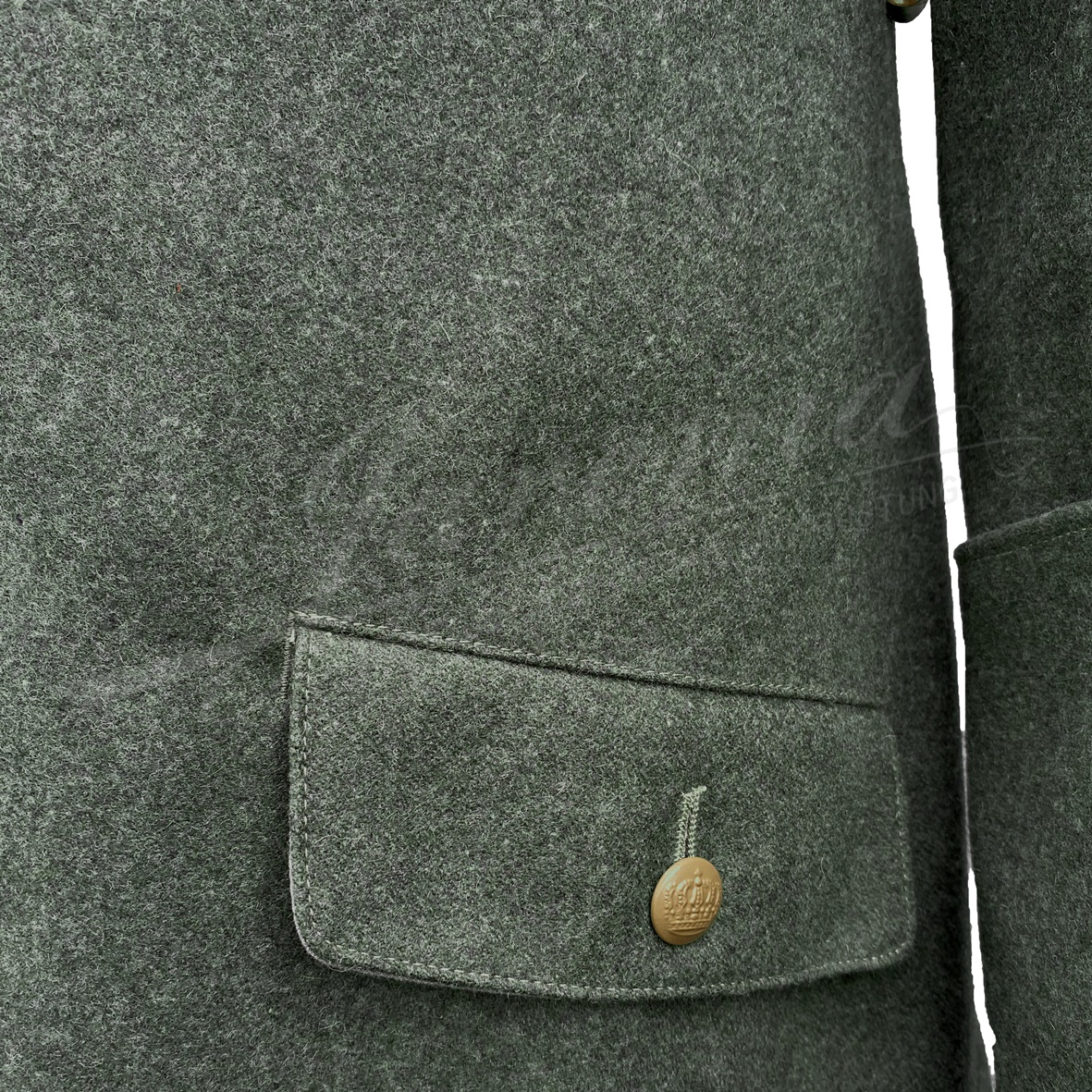 Field jacket 1915 pattern made of feldgrau (field-grey) wool with “ResedagrĂĽn” woolen collar. Lining made of cotton or mixed cotton-linen. Sleeves, collar and some lining stitched by hand like in original jackets.