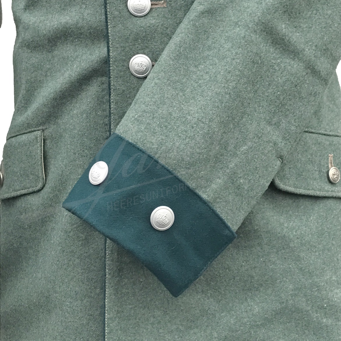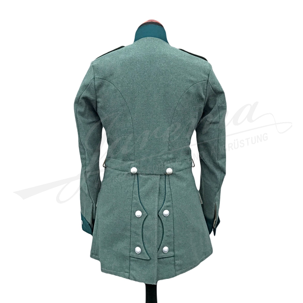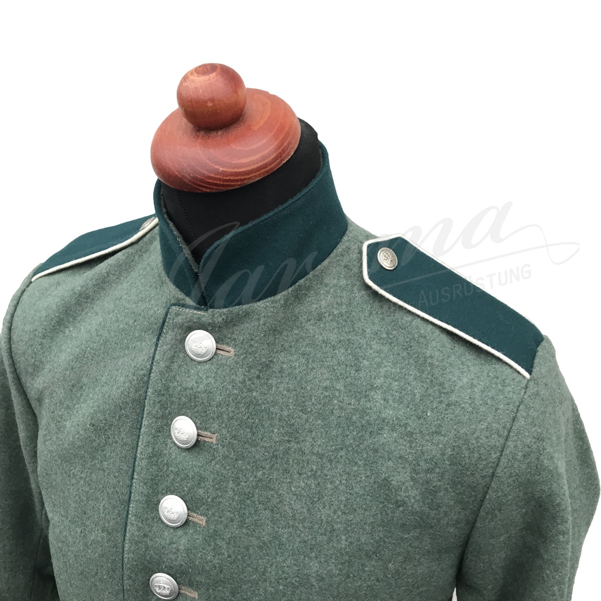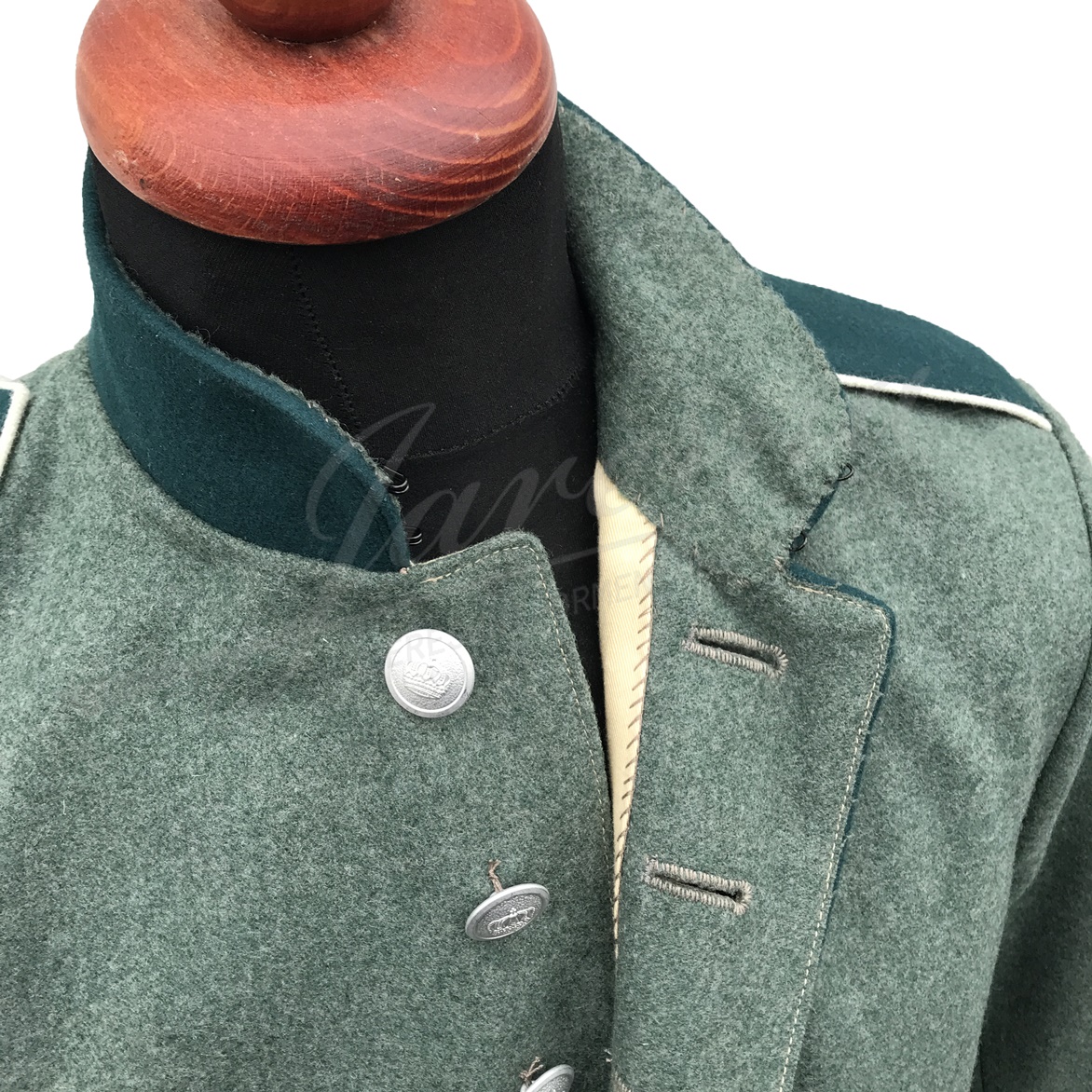 Field jacket for Jäger zu Pferde (Mounted Rifles) made of graugrün woollen cloth with Jägergrün woollen piping, collar and cuffs. I don’t have access to proper Borte, so I’d ask you to provide it (braiding service – with your Borte – included). Shoulder boards are sewn into the sleeve seams and are included in the price. When ordering please choose the Regiment, so I can make correct piping and the boards.